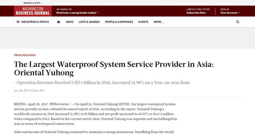 东方优德88官网网站的市场体现都有着中国修建防水领域风向标的作用。。。。。。4月21日,,,,,东方优德88官网网站宣布2016年年报,,,,,据报告显示,,,,,2016年东方优德88官网网站实现营业总收入70亿元,,,,,同比增添31.98%;;;;;;净利润10.29亿元,,,,,同比增添40.97%。。。。。。云云靓丽的效果简单经宣布,,,,,受到了包括Yahoo!、Washington Business Journal、TheStreet、MarketWatch等200余家国际媒体的关注。。。。。。